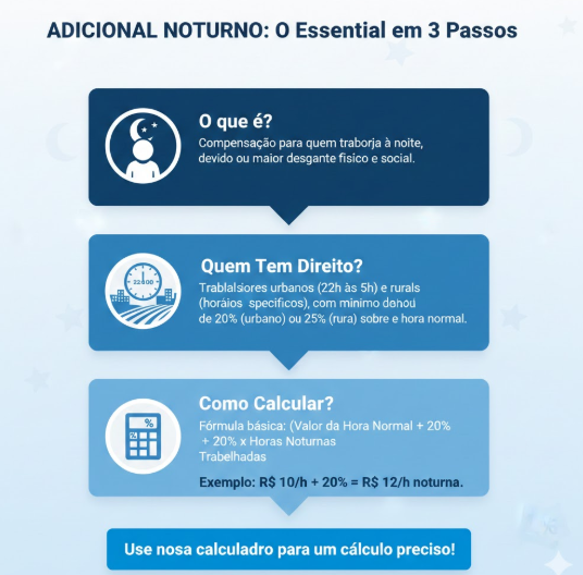 O adicional noturno é um pagamento extra devido aos trabalhadores que exercem suas funções durante o período da noite, geralmente entre 22h e 5h da manhã. Este adicional é previsto pela CLT e tem o objetivo de compensar os trabalhadores pelos danos e dificuldades que o trabalho noturno pode acarretar, como problemas de saúde, privação de sono e o aumento do risco de acidentes. Veja mais: O que é uma calculadora de adicional noturno? Guia simples para entender e usar.